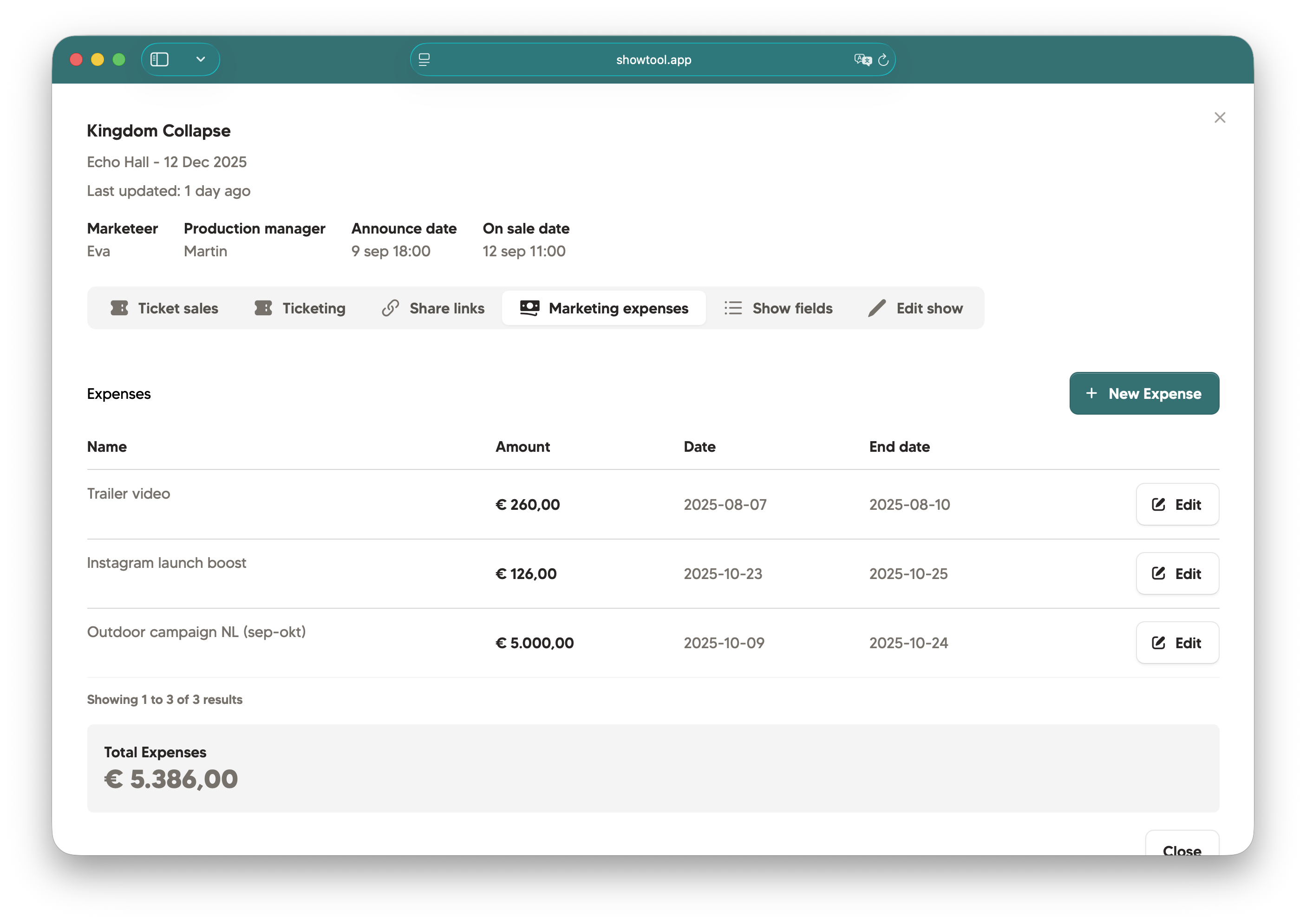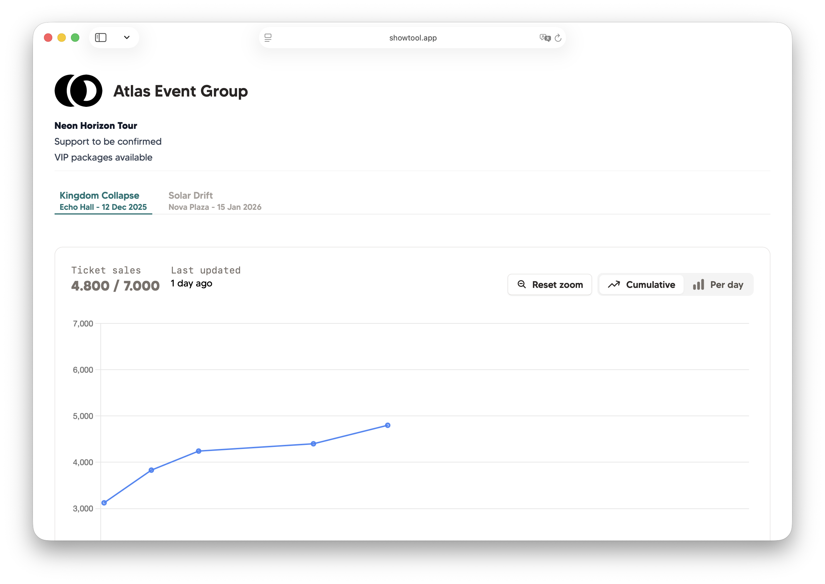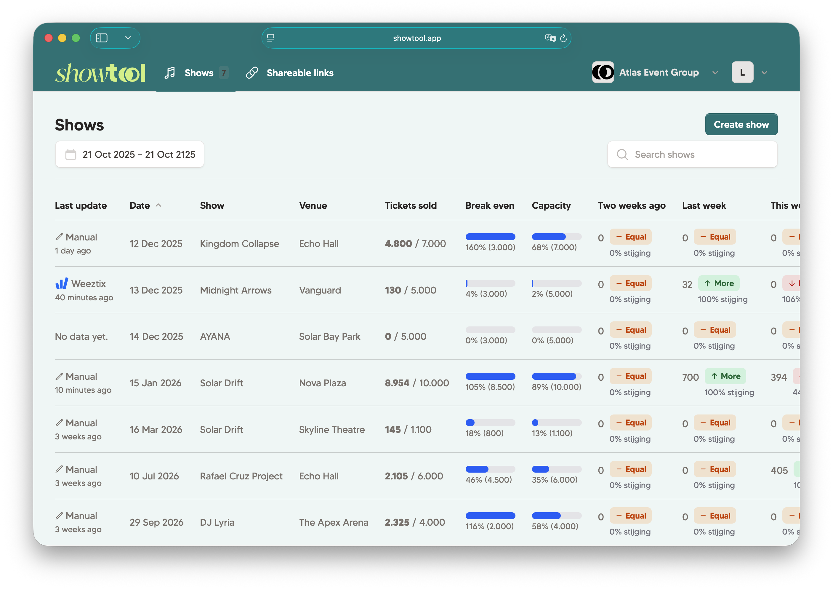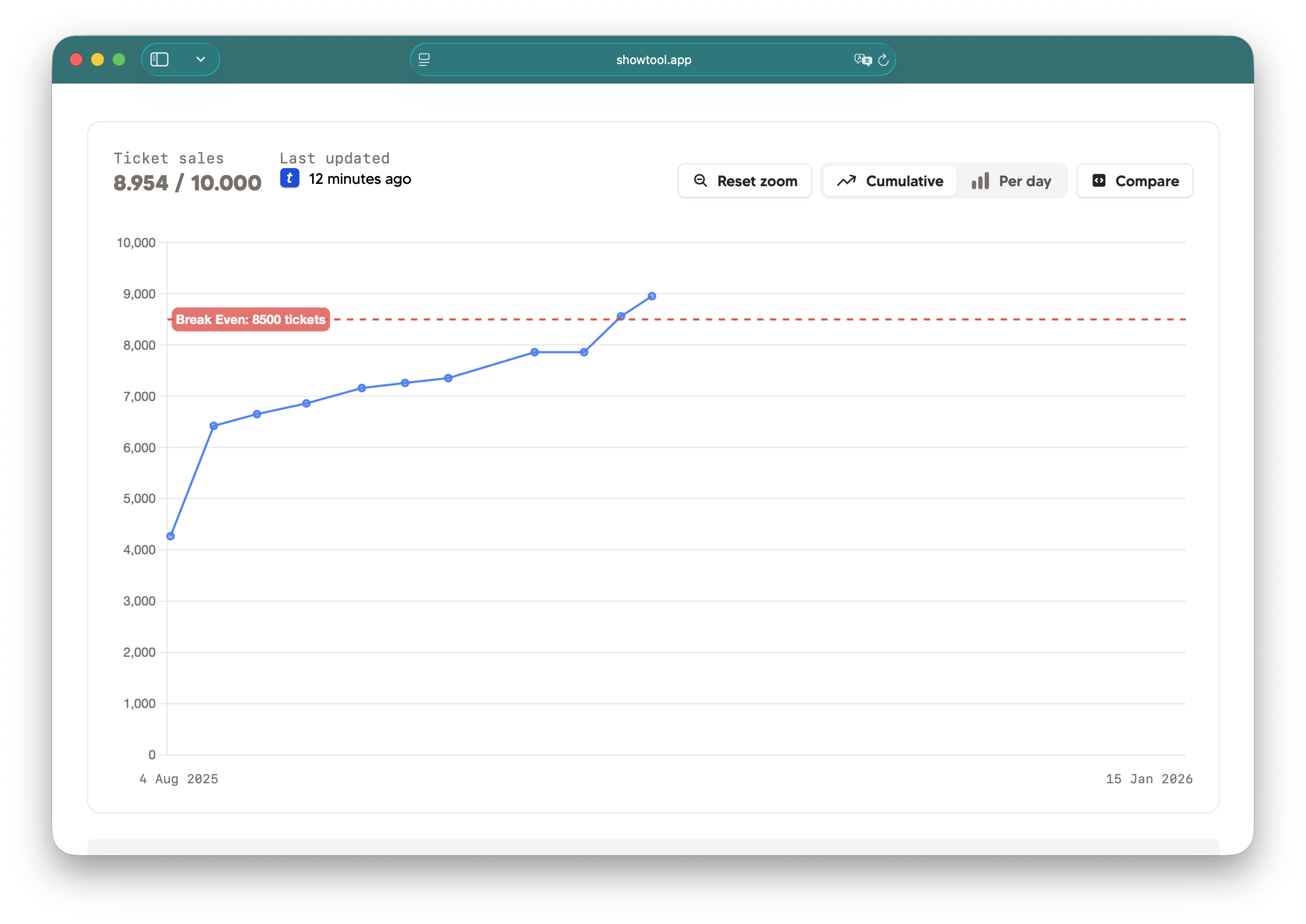 We launched Showtool because we noticed the industry missed one central spot for all your shows. Information is often scattered around platforms, gathering and communicating ticket stats can be time consuming.